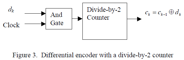 One circuit that can be used to implement a differential encoder is an exclusive-OR (XOR) gate as shown in figure 2 below. However, it can be difficult to implement the 1-bit delay in the feedback path at high data rates such as 10 Gbps.
