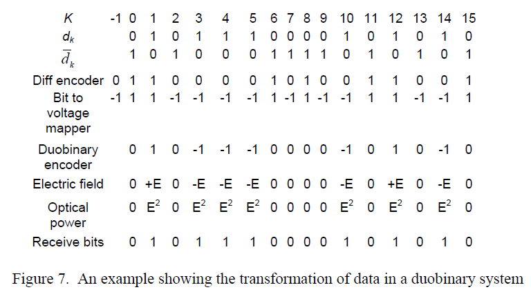 Similarly, the combinations {1 0 1} and {-1 0 –1} also can never occur at the output of the FIR filter; only a {-1 0 1} or a {1 0 –1} can occur. As will be explained later, this sequence is another reason why duobinary modulation is resilient to dispersion.