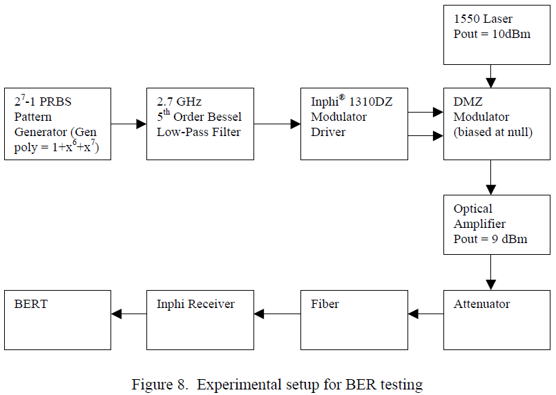 Measurements were carried out to determine the performance of duobinary modulation and compare it with that of NRZ modulation at 10 Gbps. The measurements were made at 1550nm over standard single mode fiber (SMF). This fiber has a dispersion of 17 ps/nm*km at this wavelength and an attenuation of 0.2 dB/km. The experimental setup is depicted in Figure 8. An optical amplifier was added after the MZ modulator to compensate for the loss in the MZ modulator and to launch sufficient power to transmit through 120km of fiber. The power launched into the fiber was kept as a level low enough to avoid any self-phase modulation effects.