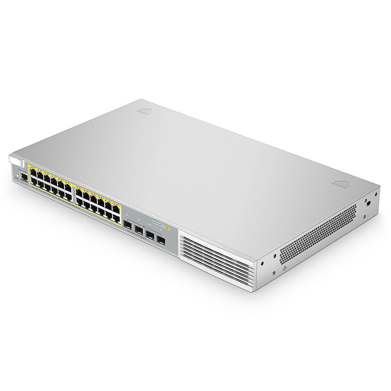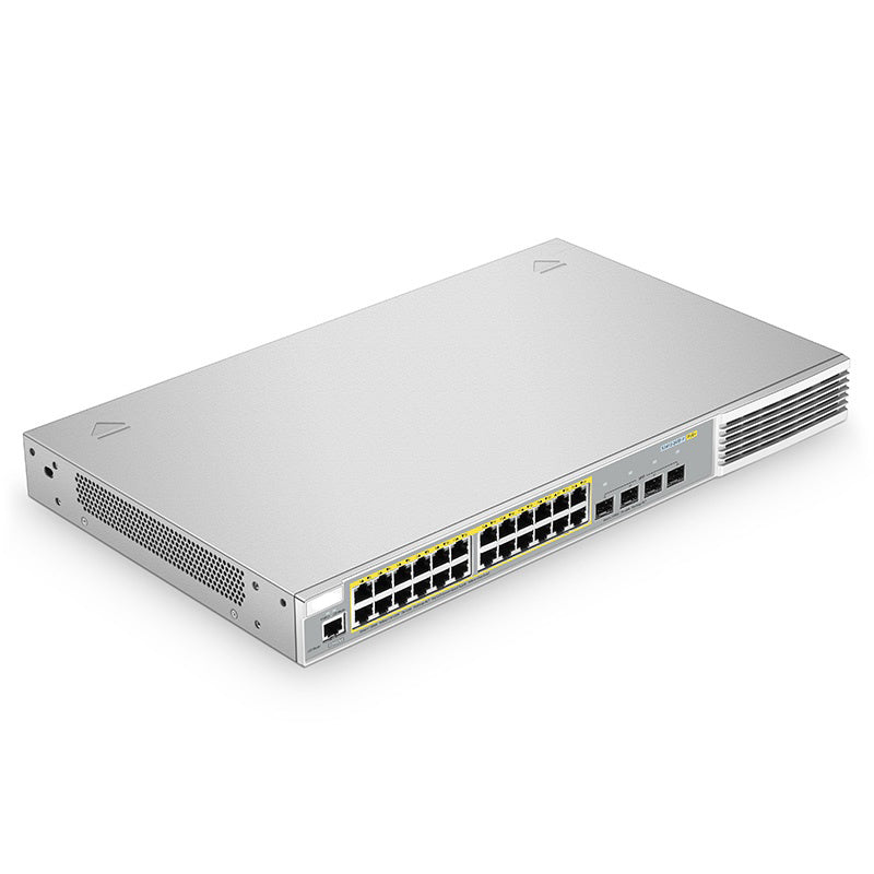 24× PoE+ access ports can transfer data and power a variety of devices, 4× 1 Gbps SFP slots enable high-bandwidth connectivity and non-blocking switching capacity.