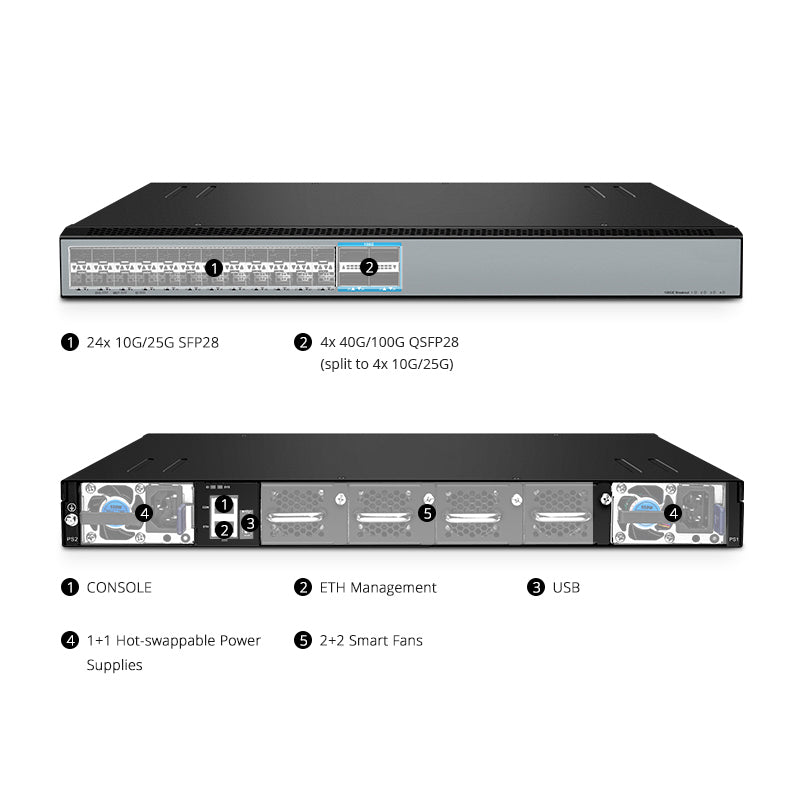 24x 25G, 4x 100G ports have low-latency and non-blocking performance, 25G ports for access switches or servers, 100G uplinks for core switches.