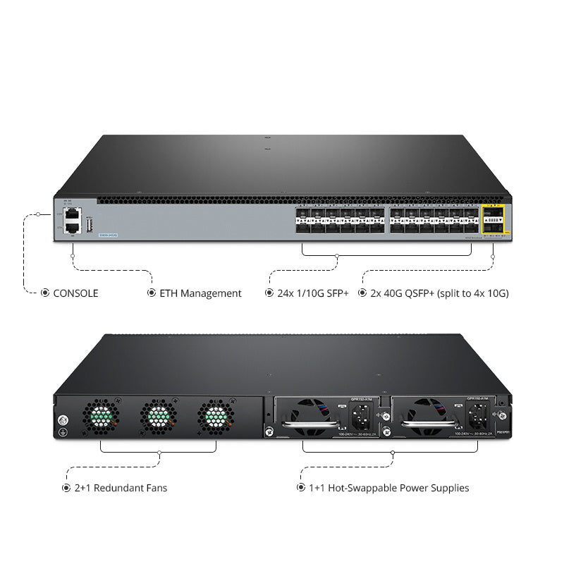 Delivering wire-speed performance on every port, full device redundancy, support L3 routing protocols such as RIP, OSPF, BGP, a comprehensive security and QoS feature set, a Front to back cooling and AC power supply input choice, and support simple device management and network management via a Command-Line Interface (CLI) as well as on on-box web UI.