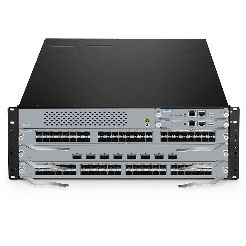 The switch also integrates rich IPv4/Ipv6 features such as OSPF, BGP, VRRP, supports QoS for better experience, and VXLAN for network scalability. Compact design with diverse line card options, high performance, and scalability—ideal for deployment in data centers, metro networks, campus networks, or converged data center-campus environments.