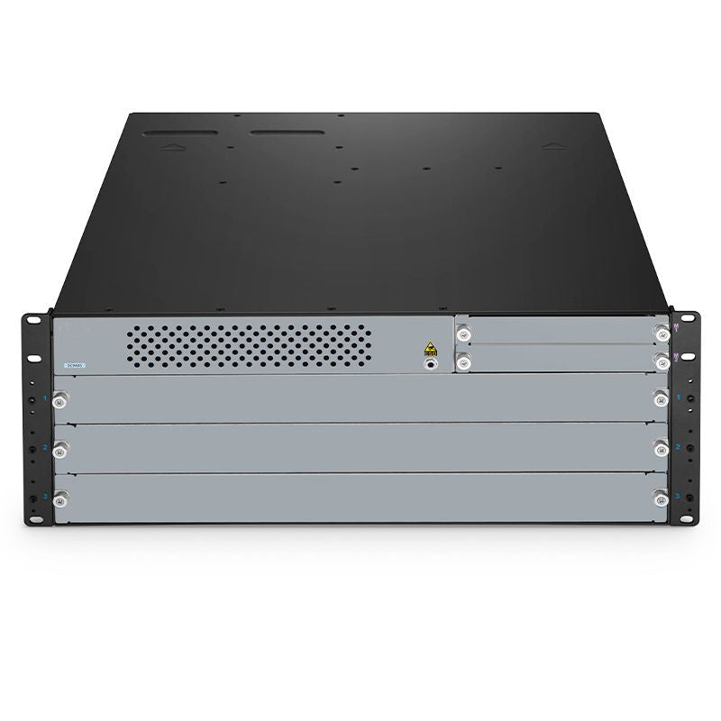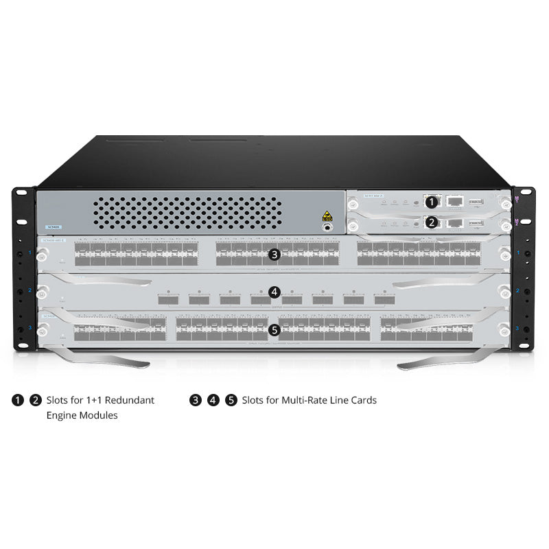 A 4U chassis with 5 slots, loaded with supporting three types of line cards, can offer a maximum of 144x 1G/10G, 96x 25G, or 24x 40G/100G full line rate ports.