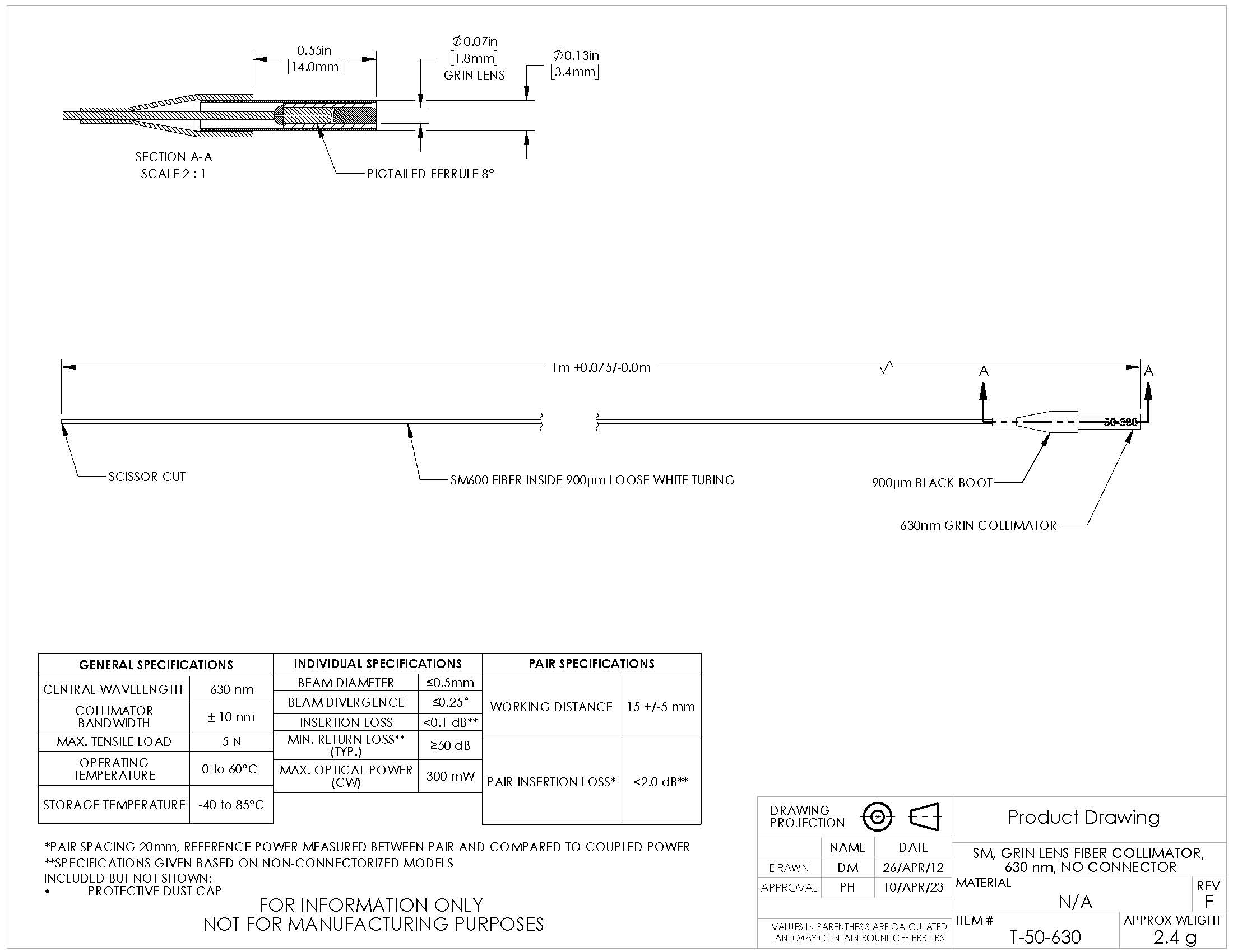 T-50-630 - Single Mode GRIN Fiber Collimator, 630 nm, No Connector