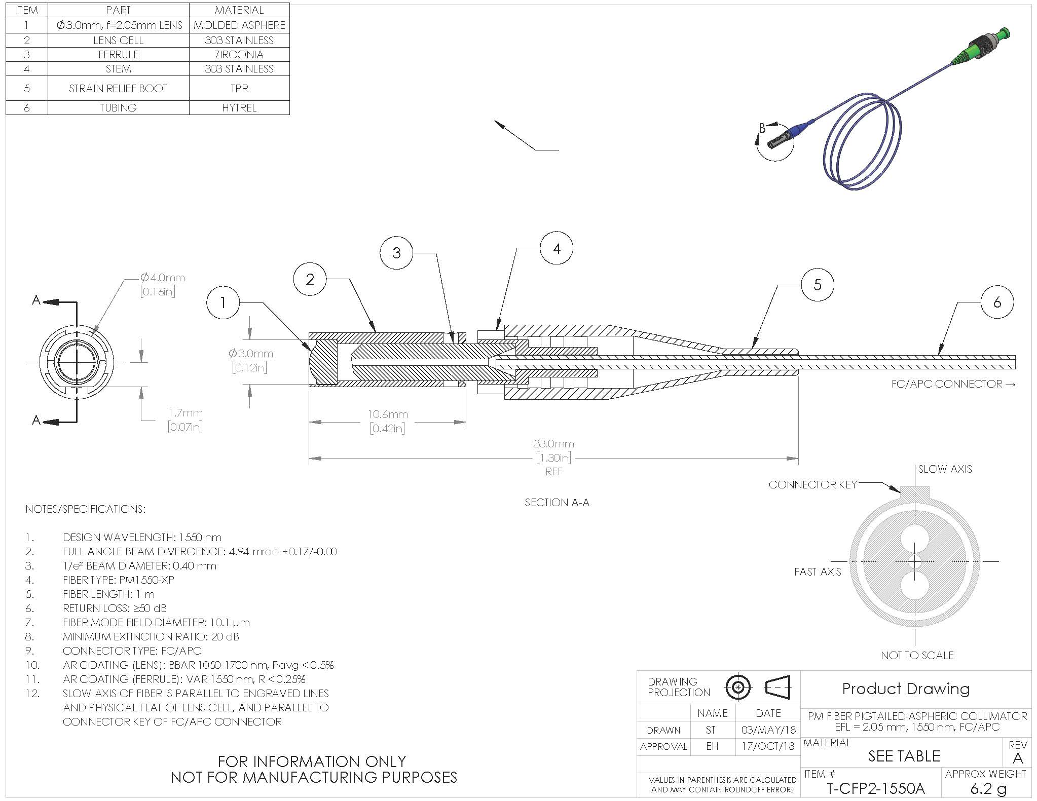 T-CFP2-1550A - PM Pigtailed Aspheric Collimator, EFL 2.05 mm, 1550 nm, FC/APC