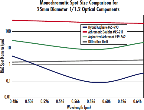 TECHSPEC® Plastic Hybrid Aspheric Lenses are molded aspheric lenses with diffraction-limited designs that eliminate chromatic aberrations caused by broadband light sources. These hybrid aspheric lenses are ideal for imaging or ophthalmic applications, or for use with tunable lasers or broadband or multispectral illumination sources. The aspheric lens eliminates spherical aberration, while the diffractive surface features a negative optical dispersion to yield excellent color correction.