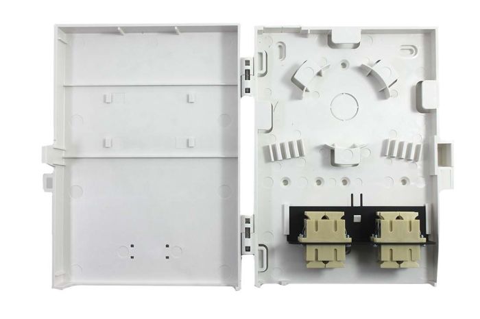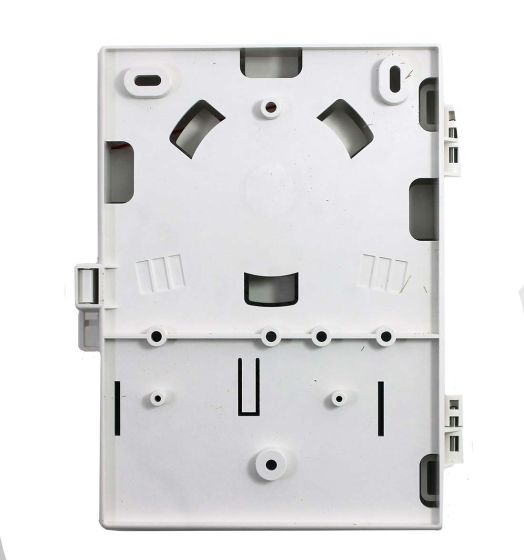 This compact, low-profile wall mount fiber enclosure is designed for small fiber distribution and termination points in indoor environments. Constructed from rugged white plastic, it provides reliable protection while offering integrated internal fiber management to maintain proper bend radius and organize slack fiber.