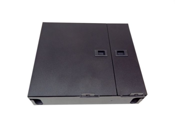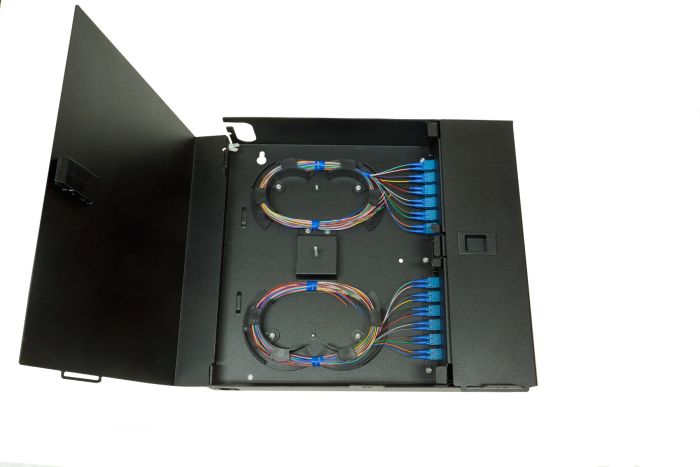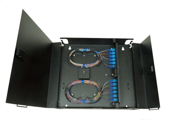 Wall Mount Fiber Enclosure – Deluxe, 2-Panel, Preloaded with LC/UPC Plates, Pigtails & Splice Tray (Black)