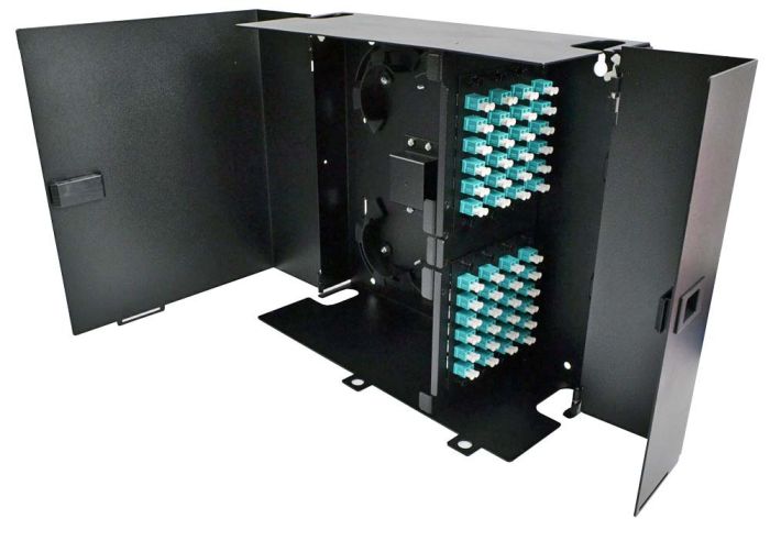 Wall Mount Enclosure 8 Panel Deluxe Loaded with 8 Duplex LC OM3 Plates & Splice Trays Black