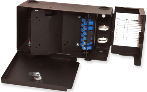 A double-door design with an integrated lock and key provides controlled access and added security, making the enclosure suitable for shared or semi-public environments. Constructed from durable 16-gauge steel with a black powder-coated finish, the enclosure offers reliable protection for fiber connections while maintaining a compact footprint. Splice trays and adapter plates are not included, allowing flexibility to configure the enclosure to specific application needs.