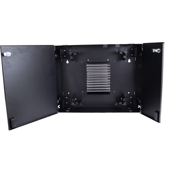 Both doors are removable to provide full access during installation and maintenance, and they are lockable for added security in shared or exposed environments. Constructed from durable 16-gauge cold-rolled steel with a black powder-coated finish, the enclosure offers strength and protection while remaining manageable for wall-mounted installations. Splice trays are not included, allowing flexibility to select trays that best match the application.