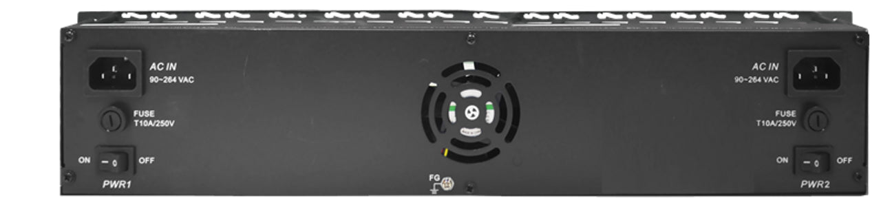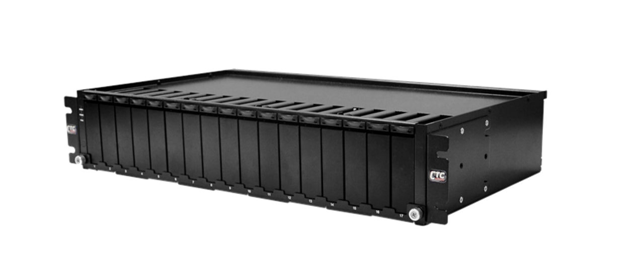 The chassis has only 2U and can accommodate 17 units of FMC series media converters. The 17 slot chassis is designed to fit a 19" wide telco rack system, placing up to 17 fiber media converters or VDSL2 modems on just 2U space height.