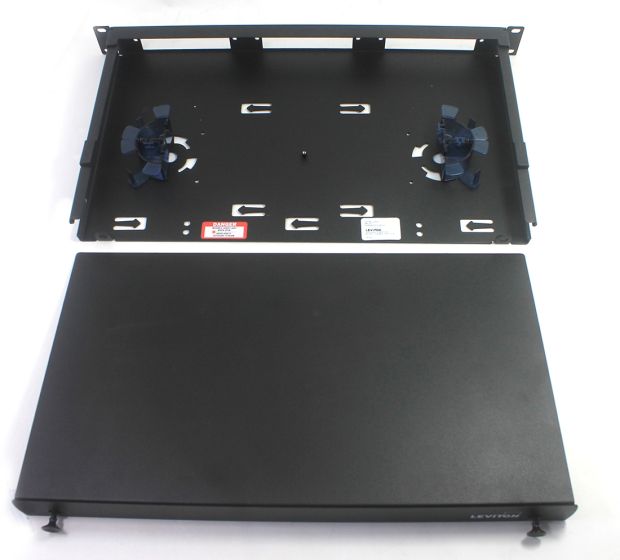 The Leviton Opt-X® 500i SDX Rack-Mount Enclosure provides interconnect or cross-connect capability between backbone cabling and active equipment while conserving valuable rack space. This 1RU flush-mount enclosure accommodates up to (3) SDX adapter plates, MTP cassettes, or splice modules, supporting up to 72 LC fibers per RU. Designed for versatility and easy field termination, it is ideal for small-enterprise and data center applications.