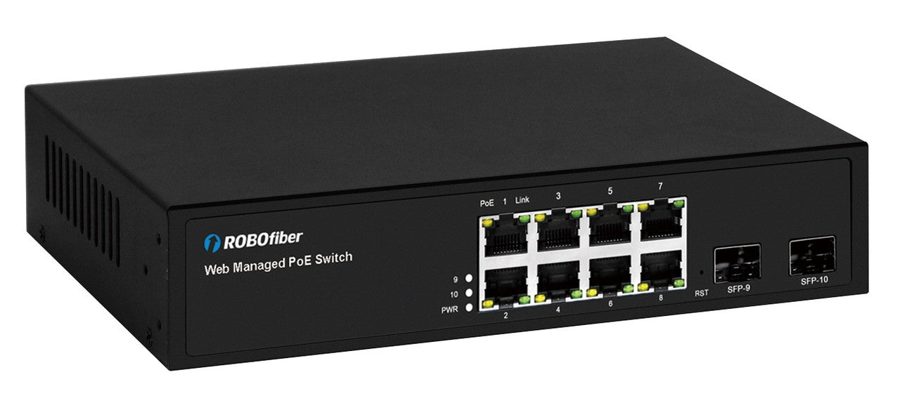 The RB-802L-PSE is a high-performance Layer 2 Smart Ethernet Switch featuring 8 Gigabit Ethernet (10/100/1000Base-Tx) ports and 2 SFP (100/1000Base-X) fiber uplink slots.