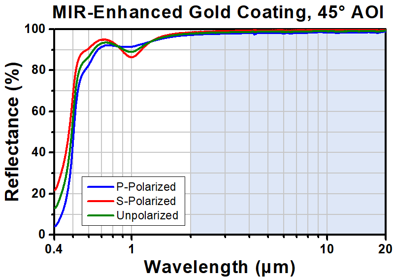 The plot to the right shows the measured reflectance of this coating as a function of wavelength. The shaded region denotes the range over which we recommend using these optics. Data was obtained using at a 45° angle of incidence.